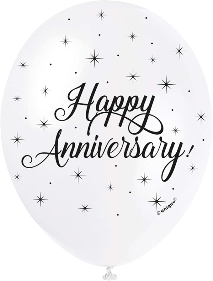 Create a fabulously festive party scene with these Pearlised Latex Happy Anniversary Balloons. Featuring “Happy Anniversary” text and a stars design printed all over, these white latex balloons are ideal for adding an elegant touch to a wedding anniversary party. Arrange them with foil balloons, a balloon weight and curling ribbon to create a dazzling table centrepiece or floor-standing balloon bouquet.