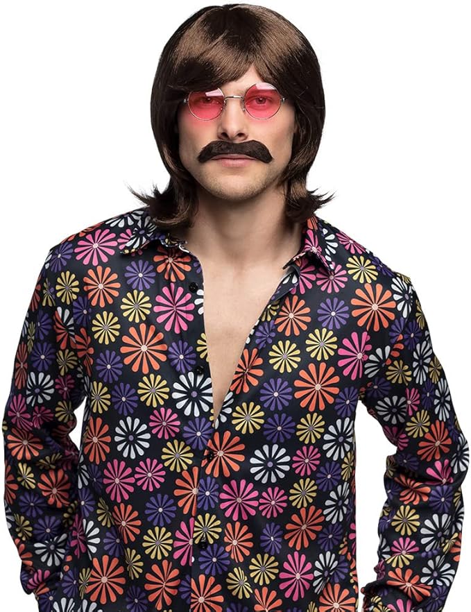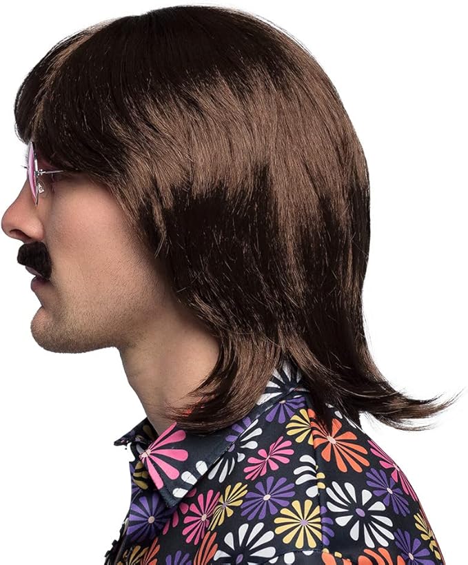 • This shoulder-length, brown men’s wig, it is the ideal addition to any hippie or flower power costume.