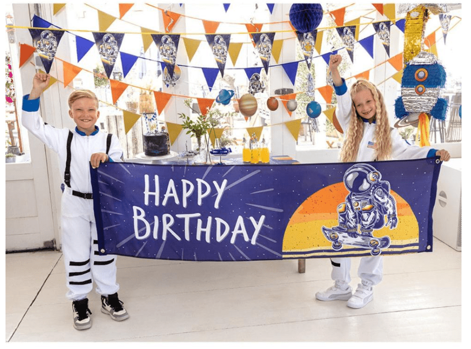 Astronaut Birthday Banner to celebrate your themed parties. We have a wide catalog of decorations for any celebration: banners, garlands, table decorations, confetti, photo booth props, etc. Decorations for birthday parties, Halloween, bachelor/bachelorette parties, and themed parties.